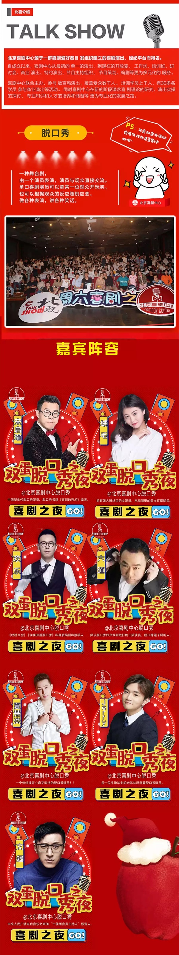 北京喜剧中心,一个拥有优秀脱口秀演员和多场脱口秀演出经验的喜剧团体,12月25日圣诞节,众多优秀脱口秀演员齐聚鱼与剧场,想看各种嘴炮大王们在台上持续输送快乐吗?那就快来北京喜剧中心圣诞狂欢深夜秀北京站,一定让你整场笑不停。