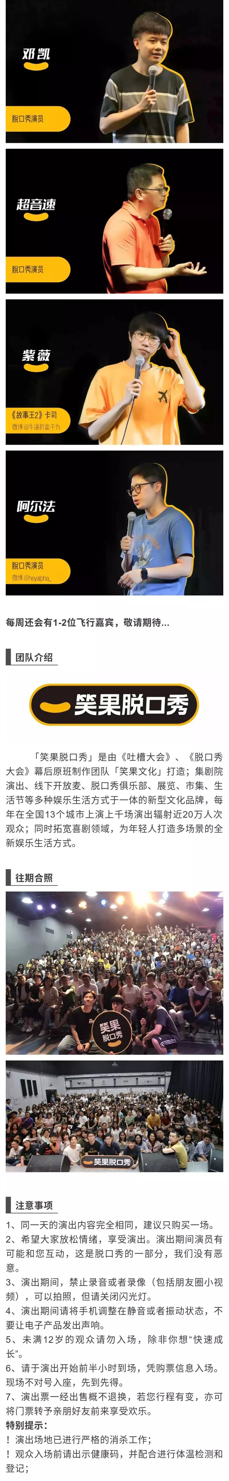 深圳笑果周六秀,请勿携带易燃易爆、毒害性、辐射性、管制刀具等危险物品进场。演出开始前请提前进场,演出前10分钟停止安检和检票,每票一人,进门一次有效。演出期间请将手机等响闹装置置于静音状态,请勿随意走动,妨碍他人观看演出,请勿在通道内滞留,在场内大声喧。感谢您的支持。
