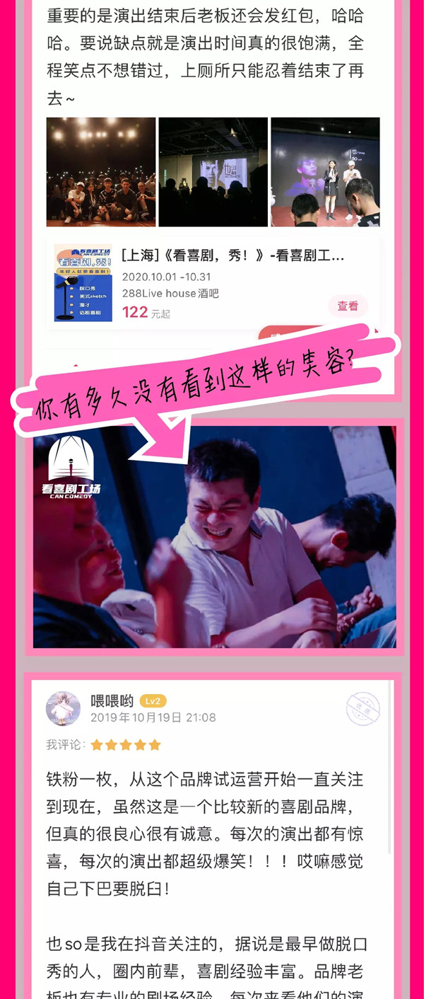 《看喜剧秀》上海脱口秀,演出开始前请提前进场,演出前10分钟停止安检和检票,每票一人,进门一次有效。观演期间请自觉维护场内卫生,请勿乱丢垃圾杂物,入场后请勿喧哗、追逐和打闹。感谢您的支持。