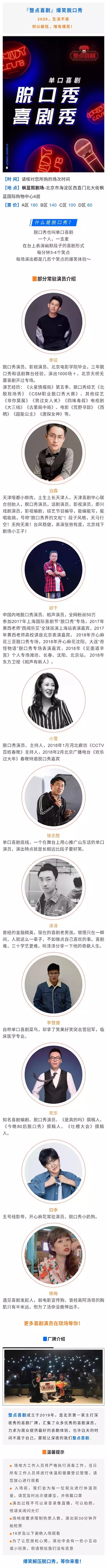 整点喜剧周五脱口秀之夜北京站,请勿携带易燃易爆、毒害性、辐射性、管制刀具等危险物品进场。请您务必在演出开始之前有序入场、对号入座,遵守安检秩序;迟到的观众要听从场务人员安排安静入场或等候幕间入场。演出期间请将手机等响闹装置置于静音状态,勿随意走动,勿妨碍他人观看演出,勿在通道内滞留,勿在场内大声喧哗。感谢您的支持。