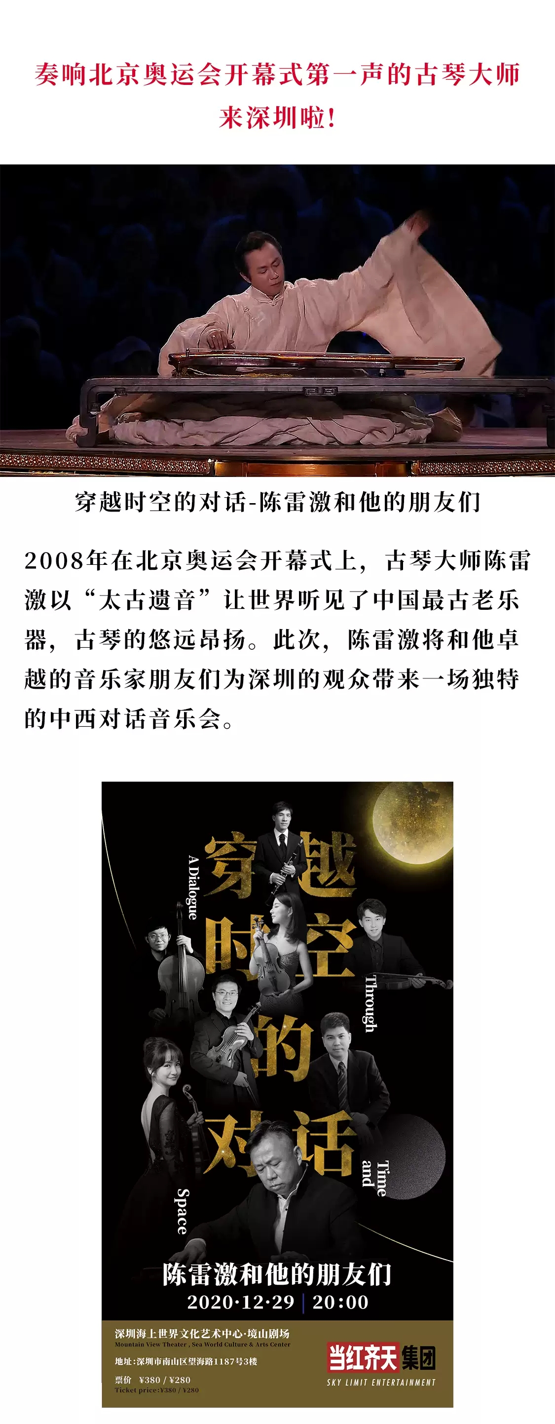 跨越时空的中国画卷徐徐展开,悠远绵长的一曲琴音蓦然而起。陈雷激和他的朋友们深圳音乐会,这将是一场震撼的古今碰撞的音乐盛宴。