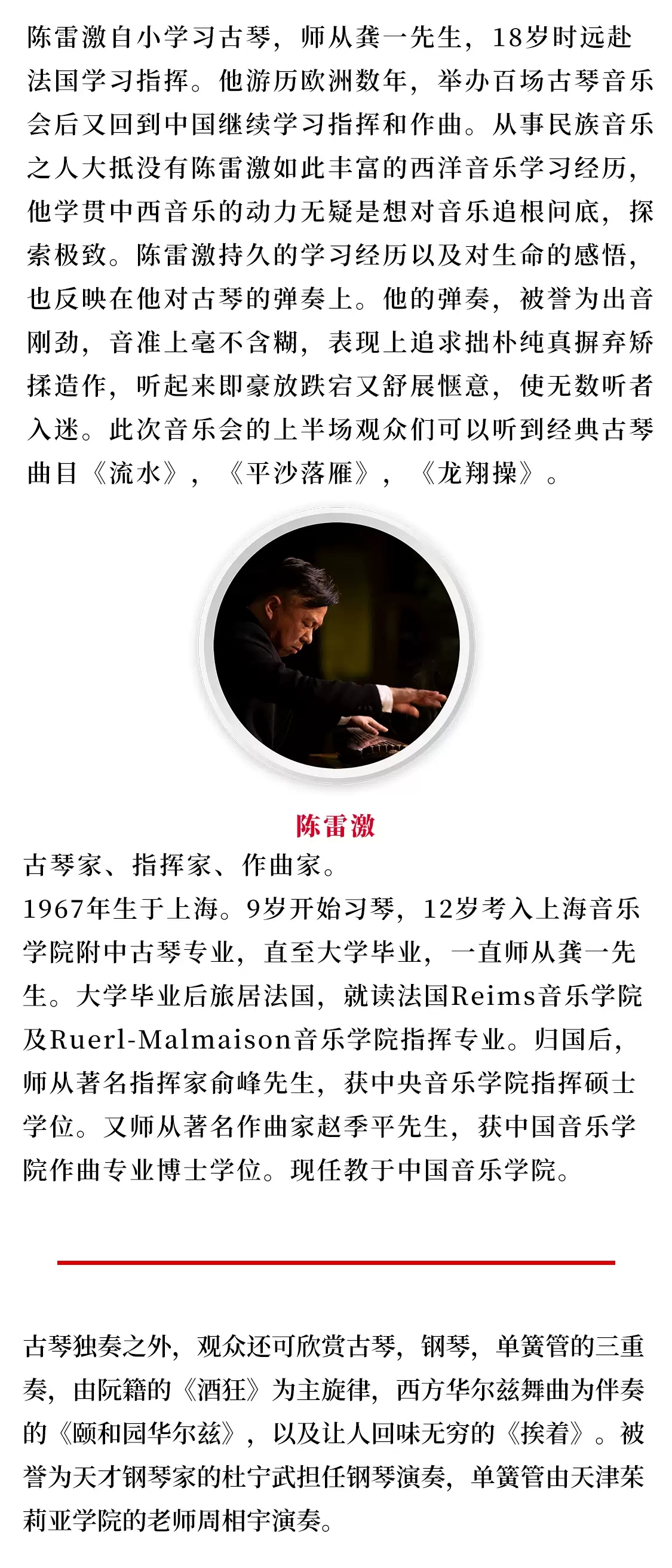 清雅的旋律,穿越千年,直抵人心,仿佛来自远古祖先的深切呼唤,又仿佛来自天地之间的深情吟唱,在拨动琴弦间倾泻出中国文化底蕴的源远流长,向世人讲述着博大厚重、意蕴悠远的中国故事。陈雷激和他的朋友们深圳音乐会,这是一次古老与年轻的音乐交流。