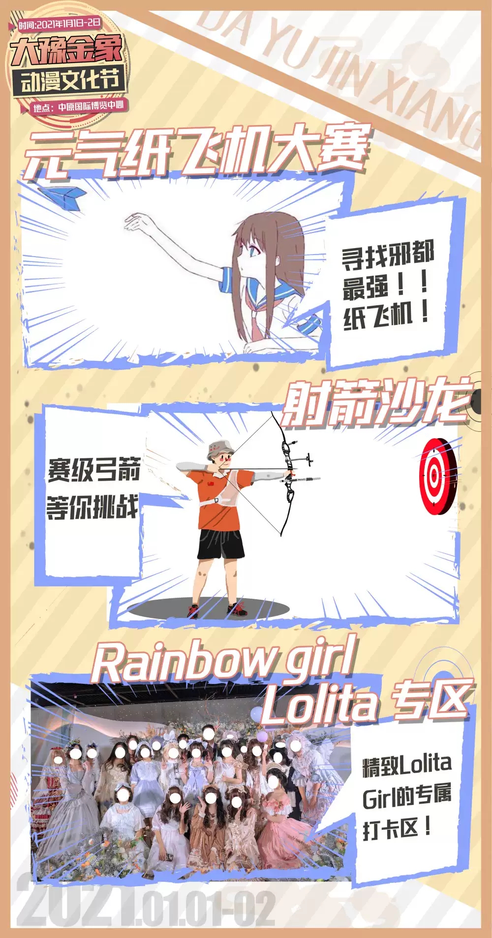 郑州大豫金象动漫文化节,请勿携带易燃易爆、毒害性、辐射性、管制刀具等危险物品进场。演出开始前请提前进场,请于开始前约90分钟入场,进门一次有效。文明观看,遵守现场秩序,请勿吸烟、随地吐痰、乱丢垃圾、损毁设施、投掷杂物。离场请随手把垃圾带离场馆感谢您的支持。