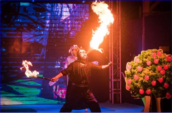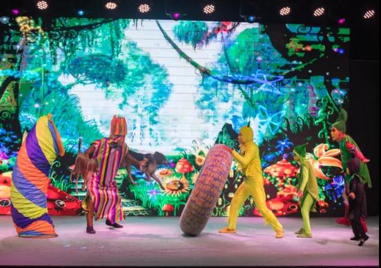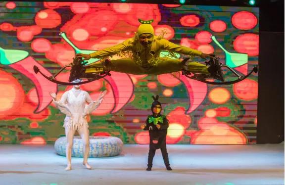 舞台上演员穿上造型可爱、豆芽元素十足的服装,倾情全力的演绎着“有关5颗小豆芽闯关,赶路不达目的决不罢休”妙趣横生的故事。惊险的杂技、拟人化形式,小豆芽们不畏艰险,智勇闯关,顽强拼搏的故事淋漓尽致的展现。