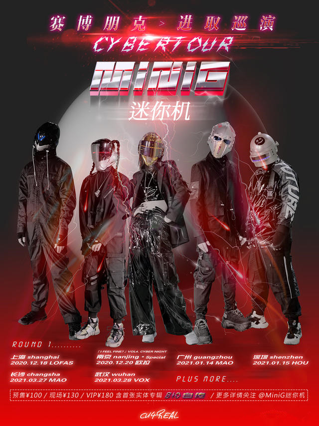 2020年可谓赛博元年,在即将进入次世代的岁末,你的派对日程表上怎么能错过赛博朋克的头号玩家MiniG迷你机?华语区绝无仅有的赛博朋克说唱乐队MiniG迷你机,携首张原创专辑《自传8IO》,正式开启乐队出道首次独立巡演,并命名为#赛博朋克进取巡演CYBERTOUR#,主题为「LOVE、LIVE、ROBOT」。这会是一场超乎想象的跨次元游戏:赛博朋克、物理外挂、真人虚拟、新派融合说唱(Rap+Vocal)、未来乐队声响(Future Band Sound)… 无论是「帅的一批」还是「怪的一批」,只要音乐响起,迷你机就会如同超级英雄一般引领到场全员进入他们的沉浸式赛博传奇。