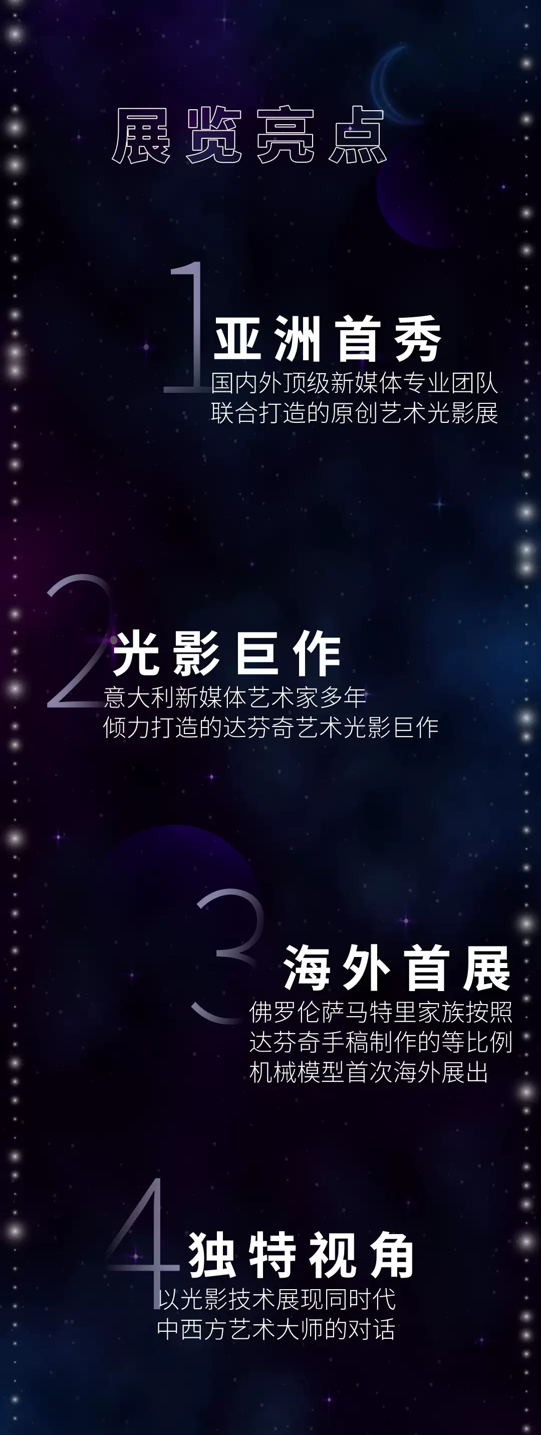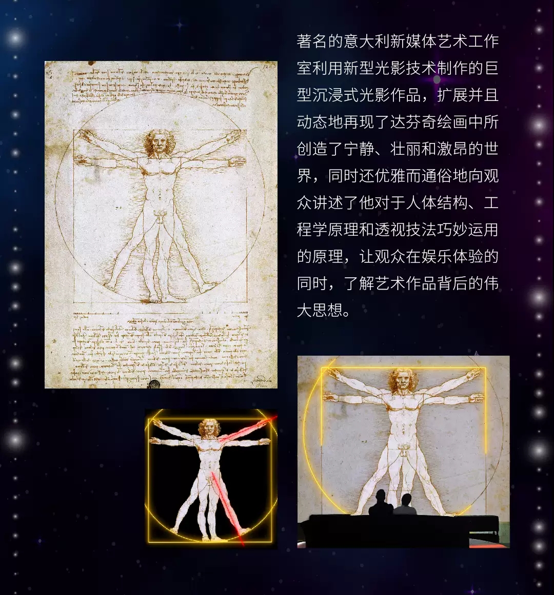 这是一场穿越时空的对话,人类思想的艺术结晶通过全新的科技手段在光影中交融碰撞,不断释放出神秘而崭新的活力。时光宝藏 对话达芬奇深圳沉浸式光影艺术展,绝对不能错过的艺术盛宴。