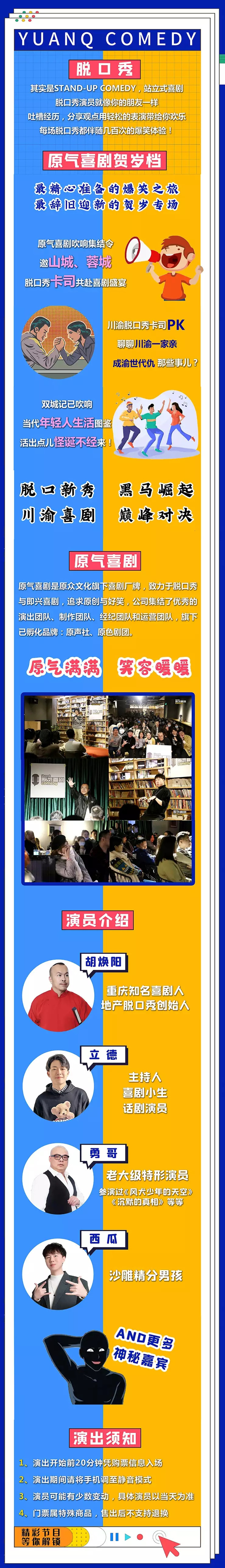 原气喜剧贺岁档重庆站,请您务必在演出开始之前有序入场、对号入座,遵守安检秩序,迟到的观众要听从场务人员安排安静入场或等候幕间入场。演出期间请勿随意走动,妨碍他人观看演出,请勿在通道内滞留,在场内大声喧。感谢您的支持。
