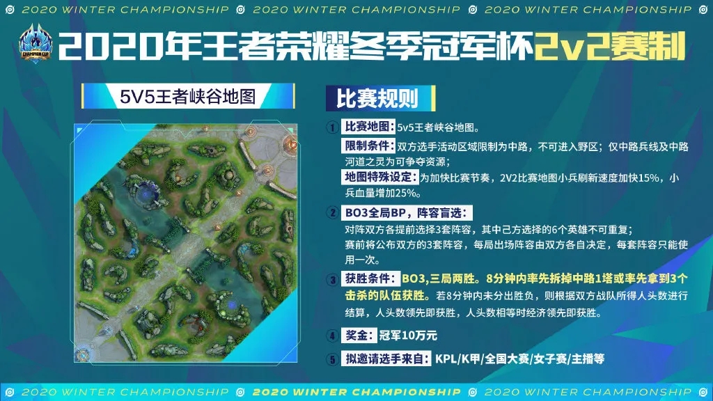 本次冬冠更有2v2比赛精彩来袭,采用5v5王者峡谷地图,BO3赛制阵容盲选,选手仅可在中路活动,加快比赛节奏,最终冠军更可获得10万元的奖金。