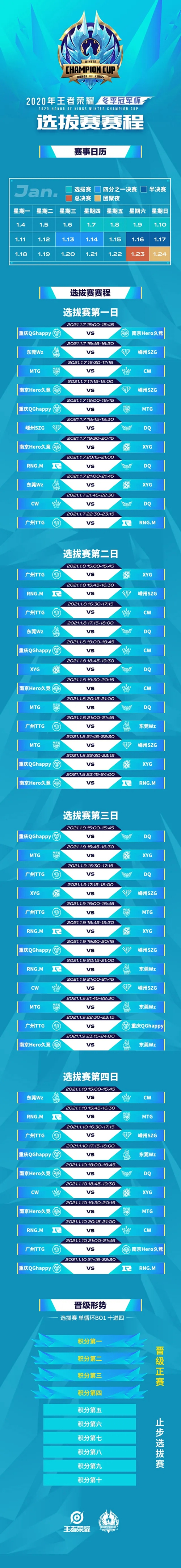 选拔赛的四支晋级队伍将会与成都AG超玩会、DYG、杭州LGD大鹅,WB.TS共同进入正赛阶段,四分之一决赛1月13日-14日,半决赛1月16日-17日,总决赛1月23日,团聚夜1月24日。