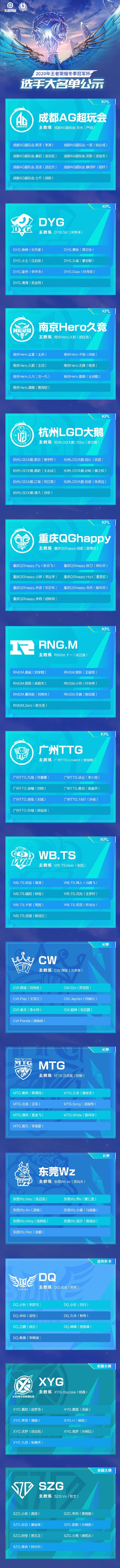KPL参赛队伍:重庆QGhappy 、南京Hero久竞、广州TTG、RNGM电子竞技俱乐部