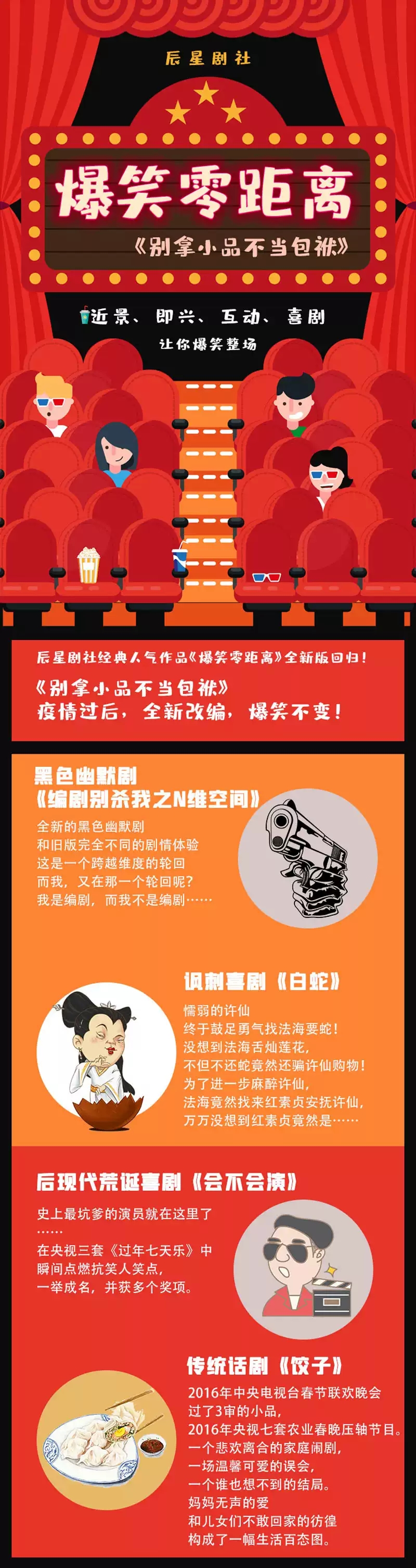辰星剧社创作的一部沉浸式互动喜剧,将观众与舞台融合成一个整体。全剧分为四个部分:《编剧别杀我之N维空间》、《白蛇》、《会不会演》、《饺子》。