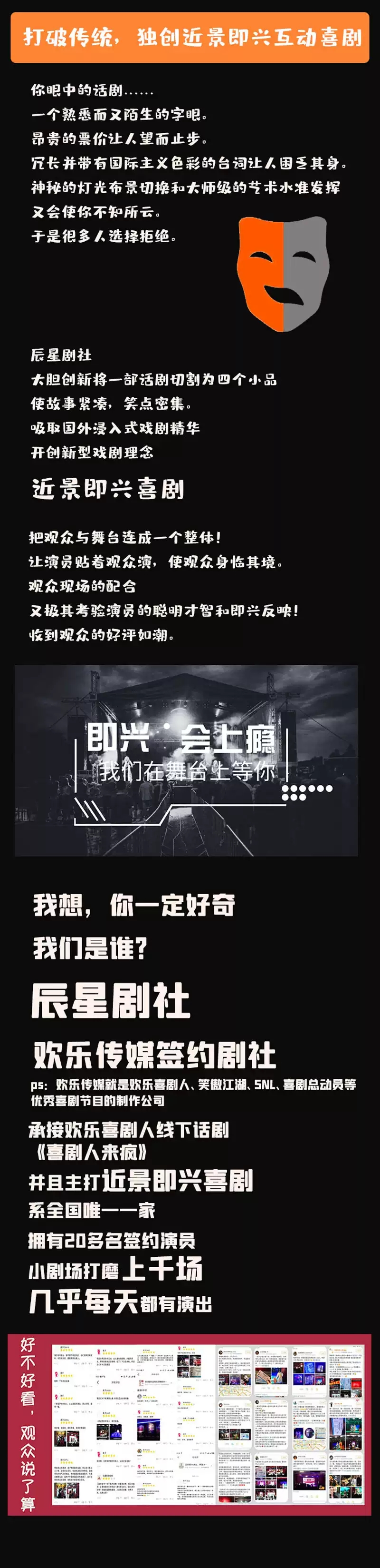 欢乐传媒签约剧社(ps:欢乐传媒就是欢乐喜剧人、笑傲江湖、SNL等优秀喜剧节目的制作公司)。成立五年以来,在北京演出几千场小剧场话剧,深受观众好评!独创了近景即兴互动喜剧的概念,打破话剧舞台第四堵墙,大量运用近景、即兴、互动的成分,一改传统话剧的形式,让话剧变得有趣、好玩!