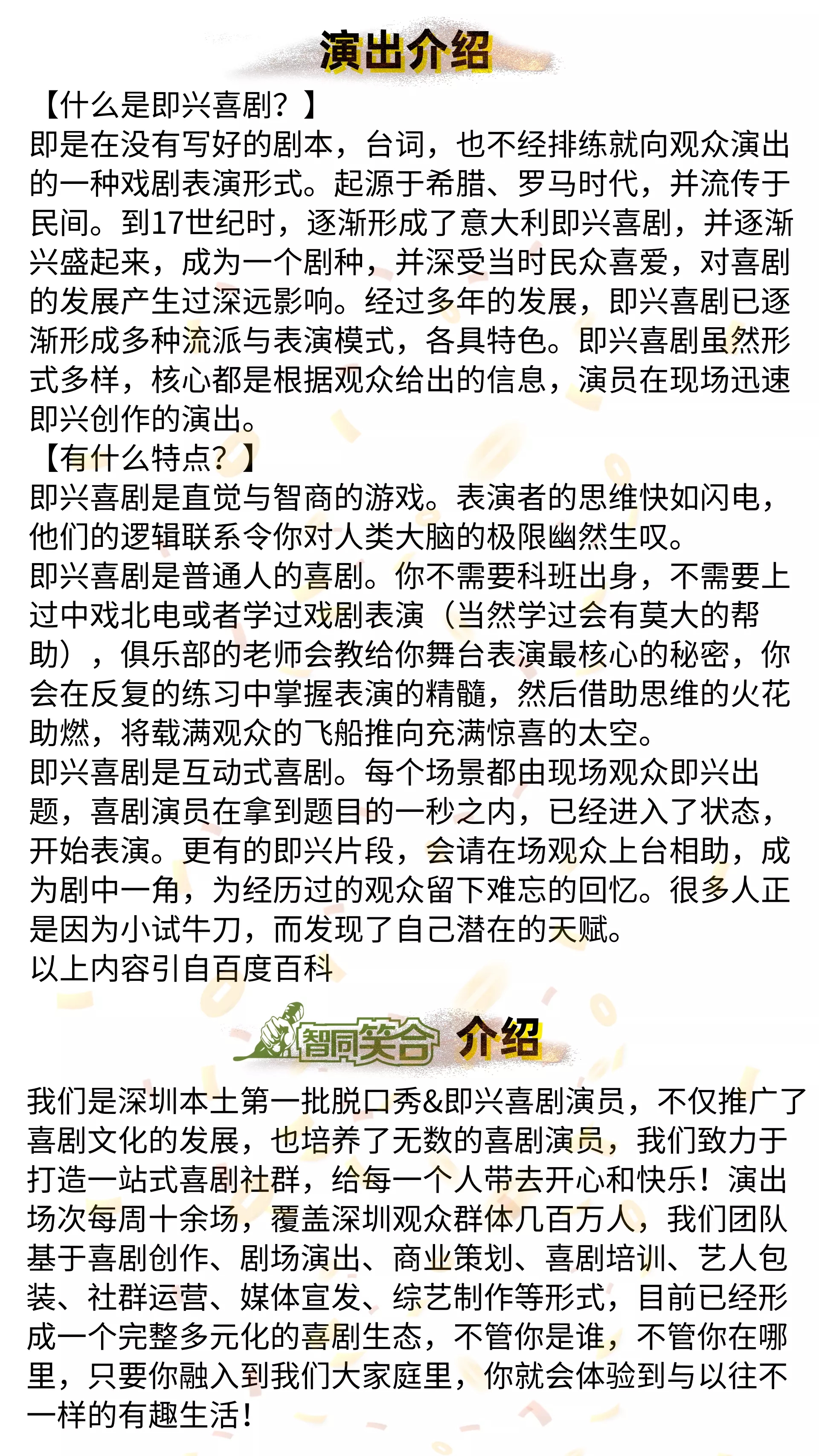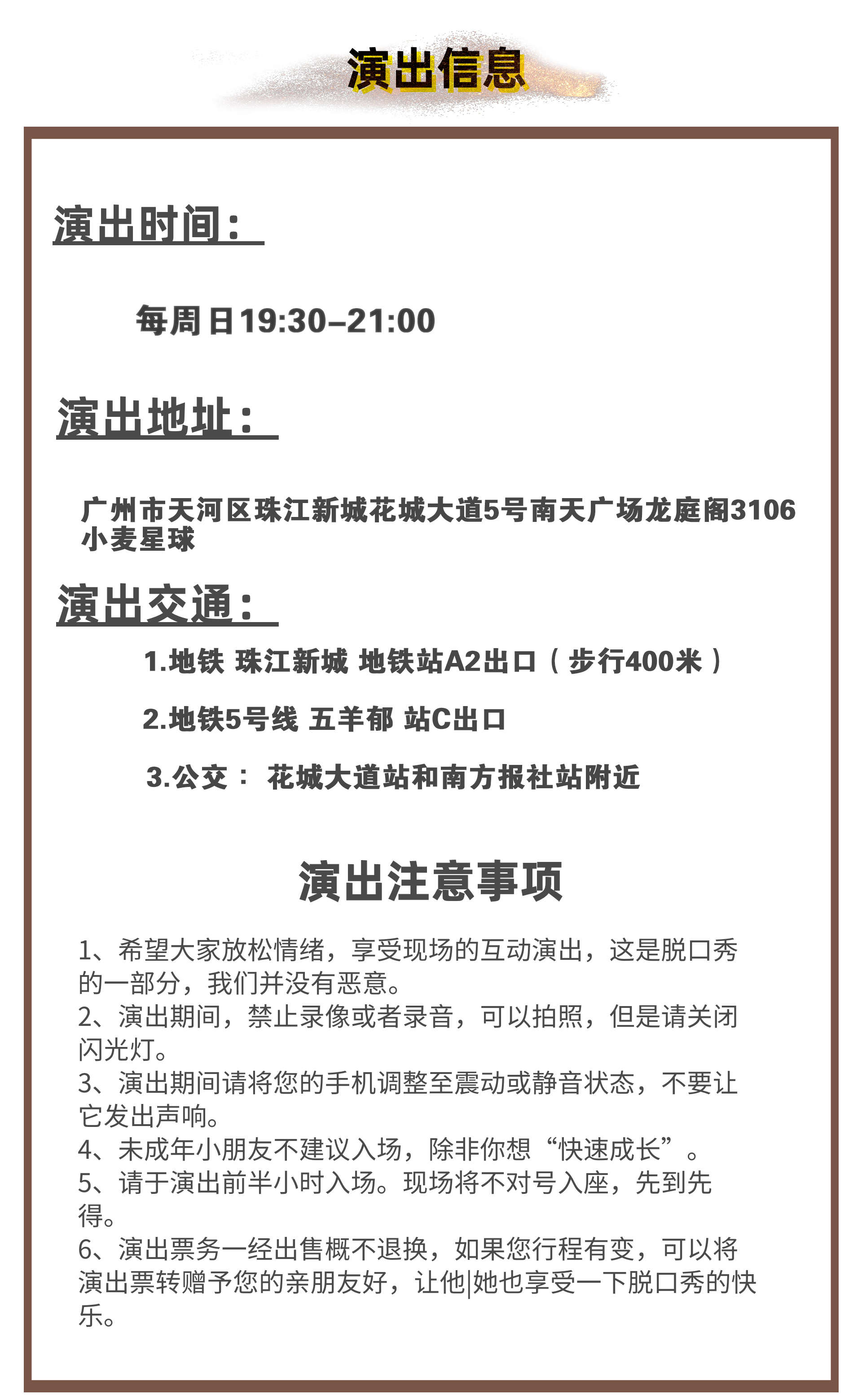 广州智同笑合周日即兴脱口秀,演出开始前请提前进场,演出前10分钟停止安检和检票,每票一人,对号入座,进门一次有效。迟到观众请就近入座。演出期间请将手机等响闹装置置于静音状态,请勿随意走动,妨碍他人观看演出,请勿在通道内滞留,在场内大声喧。感谢您的支持。