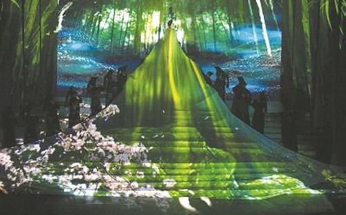 乐神引领伶伦进入一片竹林,光影摇曳,各种飞禽鸣叫着聚集过来,声音或高或低,起伏错落有致,神奇地构成一曲美妙的交响。