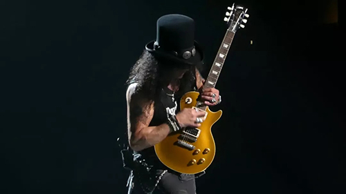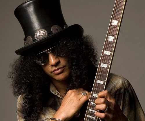 他有着标志性的一头卷发遮住脸,看不清他的相貌,身上挂着一把电吉他,表演的时候甚至不看观众一心只有这把吉它,很多人却因此爱上他。他是硬摇滚迷最爱的摇滚乐队之一——Guns N’ Roses(枪炮与玫瑰乐队)的前主音吉它手,枪花乐队的创始成员之一。他就是Slash!