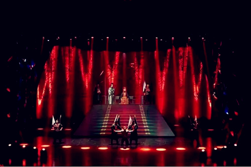 当3颗火红的太阳从舞台上飞出来的时候,舞台上所有人和整个剧场都失去地心引力,被吸到天空,真的太震撼了。这种就像被烈火包围的特效,简直突破了以前我们对舞台剧的渺小认知,原来舞台剧还可以这样来呈现!