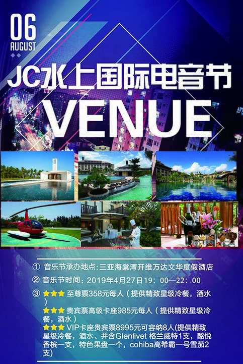 2019三亚JC水上国际电音节,4月27日强势登陆三亚开维万达文华度假酒店,