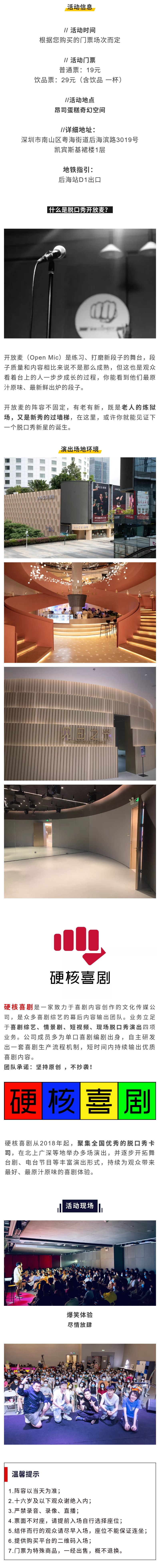 硬核喜剧周四开放麦深圳站,请大家遵守秩序,注意维护场内环境及氛围,请勿携带武器、烟花爆竹、激光器、激光笔入场。严禁携带易燃、易爆炸和管制刀具等危险物品入场。