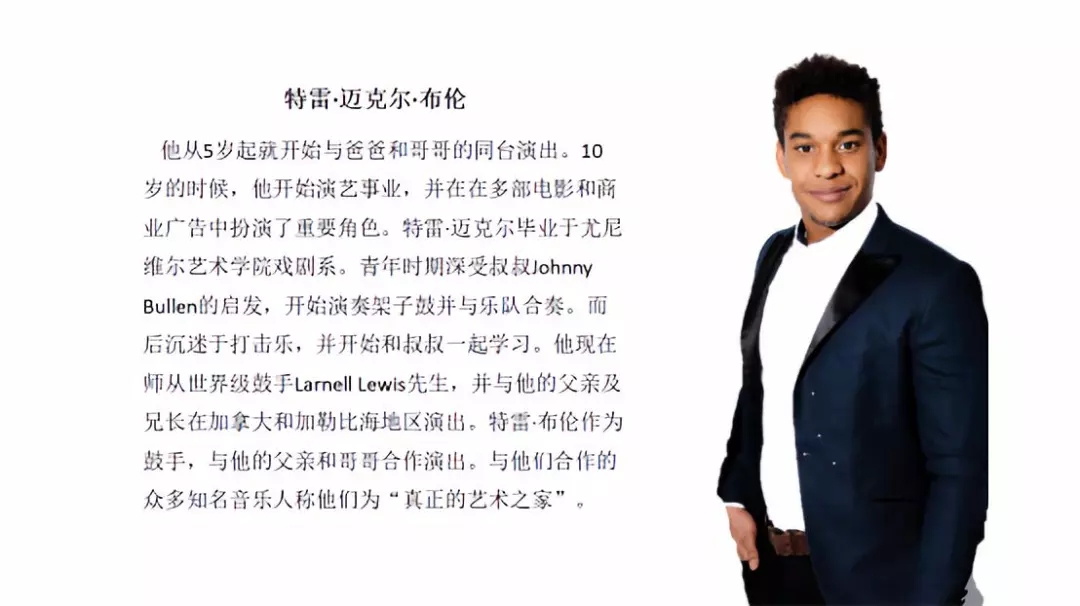 他从5岁起就开始与爸爸和哥哥的同台演出。10岁的时候,他开始演艺事业,并在在多部电影和商业广告中扮演了重要角色。特雷•迈克尔毕业于尤尼维尔艺术学院戏剧系。青年时期深受叔叔Johnny Bullen的启发,开始演奏架子鼓并与乐队合奏。而后沉迷于打击乐,并开始和叔叔一起学习。他现在师从世界级鼓手Larnell Lewis先生,并与他的父亲及兄长在加拿大和加勒比海地区演出。特雷•布伦作为鼓手,与他的父亲和哥哥合作演出。与他们合作的众多知名音乐人称他们为“真正的艺术之家”。