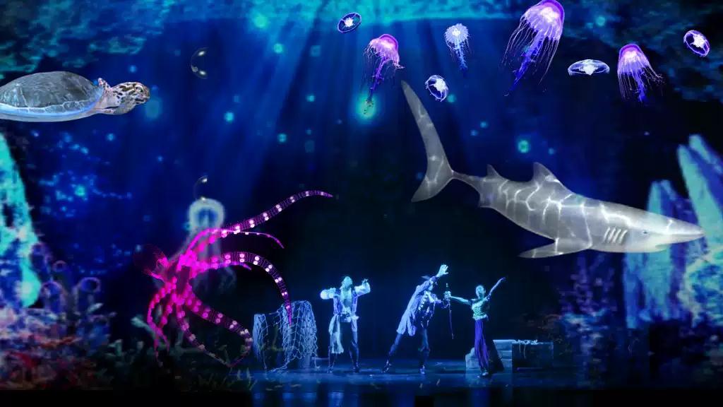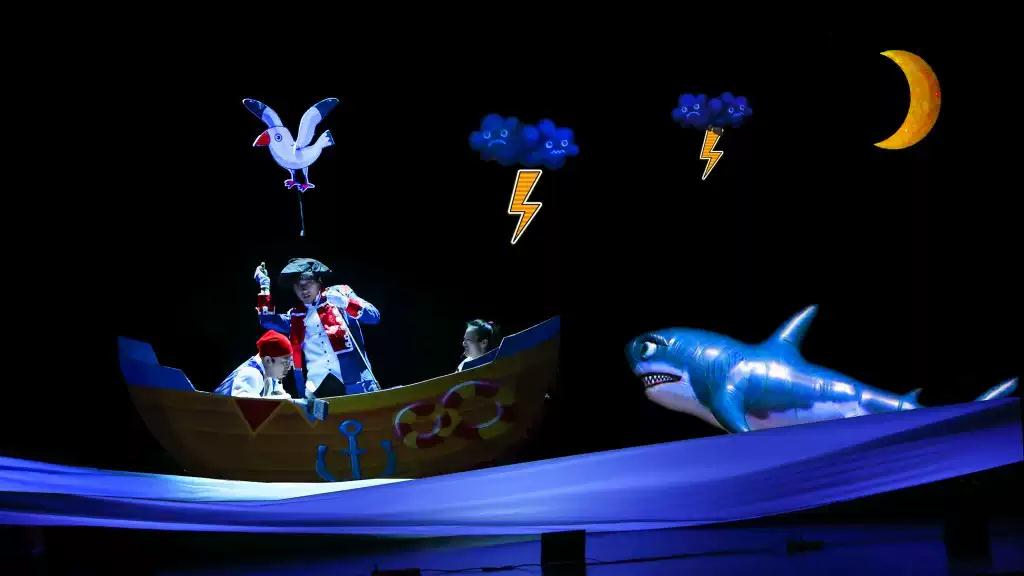 制作团队呕心沥血,借助高科技多媒体全息、创意黑光等技术,同时设置前后两块全景幕布,营造震撼3D立体效果,将海上风暴掀起的惊涛骇浪、来势汹汹的大鲨鱼、云端自由翱翔等各个视觉大秀现场一同献给小朋友。