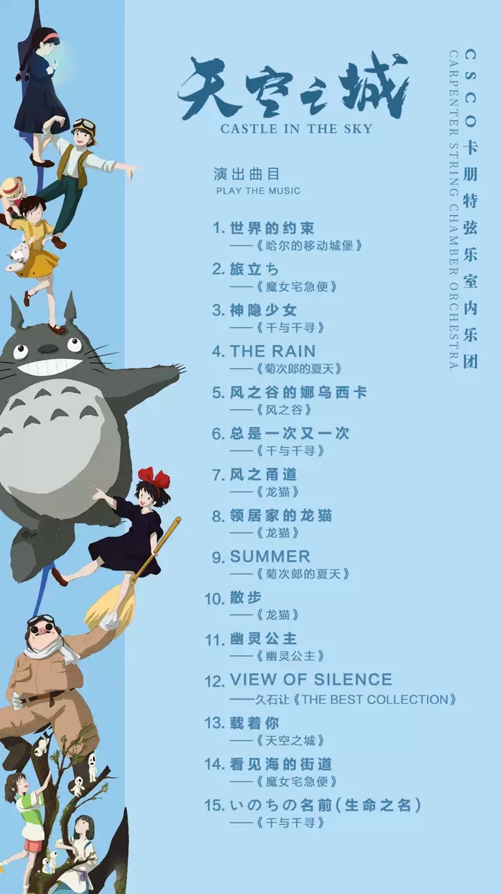 这次我们精挑细选出来的每一首作品都很符合音乐会的主题。演奏的内容是根据原曲,邀请了优秀作曲家富有针对性地重新做了编配,打造成适合于室内乐及弦乐五重奏等演奏的版本:充满天真童趣的《龙猫》、音乐色彩斑斓又不失大和民族特色的《千与千寻》、糅合了美国乡村音乐与民谣风格的《魔女宅急便》等,可以说是将散落的宝石精心串联起来了;其中的配乐可以说是不俗但是易懂,旋律给人独特的情感享受,有很大的年龄宽容度,不同的观众都可以从中得到美妙的体验。绝对可以让大家重温经典,进一步加深对大师作品的理解,获得真正美好的享受。这一夜,久石让将带着我们,乘着娜乌西卡的飞行器穿越过风之谷,徜徉在萤光闪烁的山林中,再搭乘安静的旧式火车滑过寂静水面,奔向奇妙的神隐之乡……