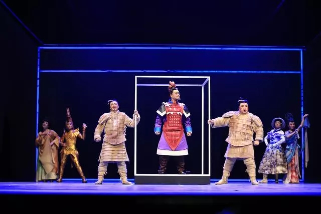 儿童剧《我们是秦俑》以博物馆文物为创作原型,将文物卡通化、儿童化,让文物在剧中真正的“活”起来,通过憨态可掬、孩子喜闻乐见的形象展现文物古老的故事。该剧采用多种舞台表演形式进行展现,音乐融合了陕西地方戏曲秦腔的元素,使剧目更加凸显地域特色。多媒体的使用在剧目中发挥出提亮点睛的作用,让观众能够身临其境,得到最佳的观剧体验。整部剧目节奏明快、生动活泼、老少咸宜、寓教于乐,能让孩子们在快乐中学习和解读文化、提升对历史文化的兴趣。