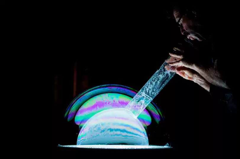 他将通过不同效果来创造泡泡,比如照明,激光,氦气,蒸汽,雾…以及你能想象到各种形状,从方形到巨大的长条形,甜甜圈,气泡中的人,火山, 龙卷风,火箭,飞碟等。