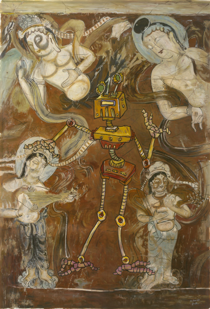 DrMi星球北京展览,以科幻文化元素为主题,以佛教壁画、潮牌、时尚元素、涂鸦、卡通、真实场景等艺术形象为背景,大胆创作展示出抽象化的、高度智能化的“未来机器人”的科幻形象。