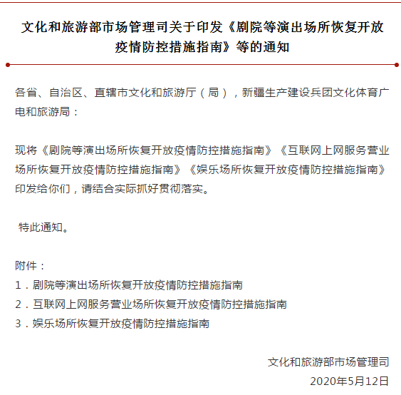 5月13日,文化和旅游部印发《剧院等演出场所恢复开放疫情防控措施指南》、《娱乐场所恢复开放疫情防控措施指南》、《互联网上网服务营业场所恢复开放疫情防控措施指南》三份《指南》,指导线下剧院、网吧、娱乐场所复产复工。并明确要求演出场所上座率不得超30%,娱乐场所限流50%。