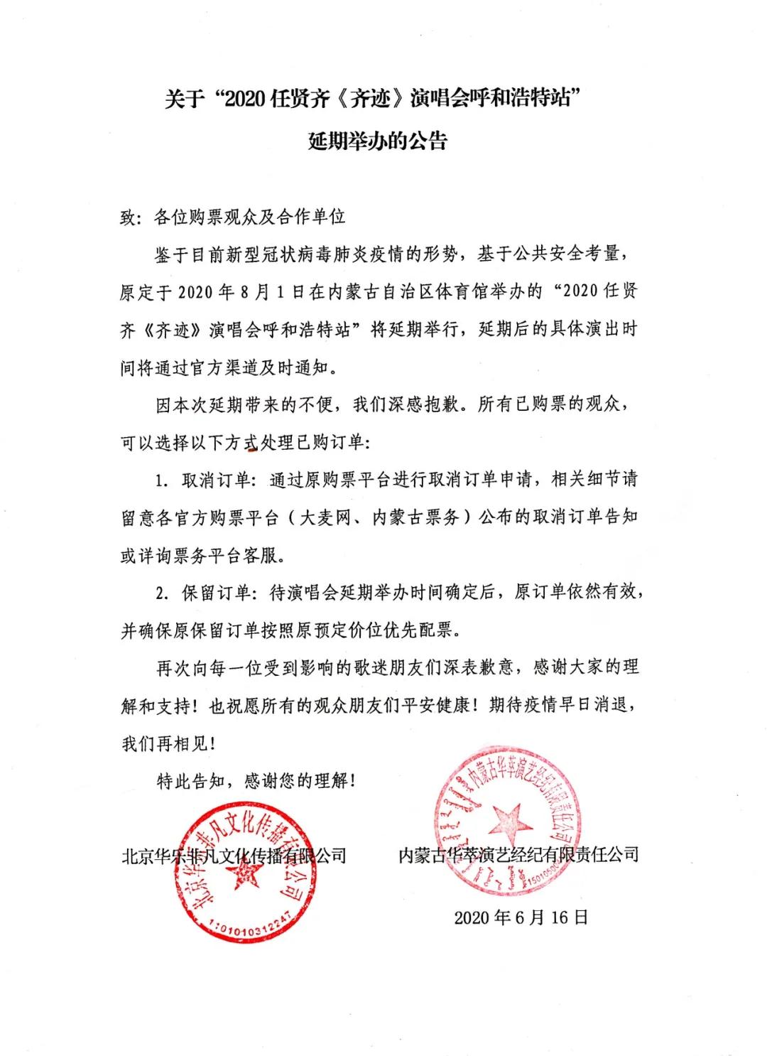 任贤齐呼和浩特演唱会确定延期举办,鉴于目前新型冠状病毒肺炎疫情的形势,基于公共安全考量,原定于2020年8月1日在内蒙古自治区体育馆举办的“2020任贤齐《齐迹》演唱会呼和浩特站”将延期举行,延期后的具体时间等待通知。想知道此次演唱会延期到什么时候,就请关注“官网”,随时都能了解情况哦!期待疫情早日消退,与小齐哥在大草原相聚,在这最辽阔的天空下合唱最豪迈的歌!