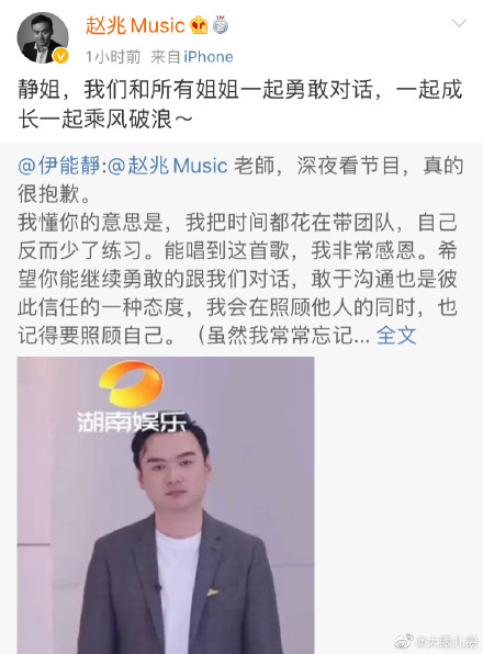 伊能静的道歉,贴心的赵导师也很快回复:静姐,我们和所有姐姐一起勇敢对话,一起成长一起乘风破浪~