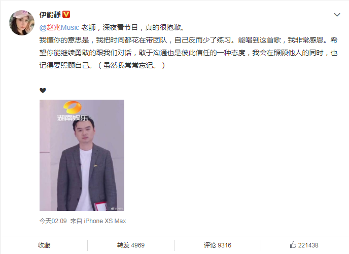 6月20日,也就是今天,伊能静发微博向赵兆道歉了。