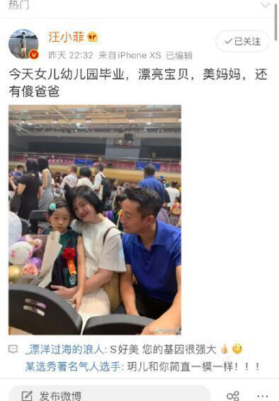 23日晚10点,汪小菲发微博,“今天女儿幼儿园毕业,漂亮宝贝,美妈妈,还有傻爸爸 ”并晒出与小大S一同参加女儿毕业典礼的合照。