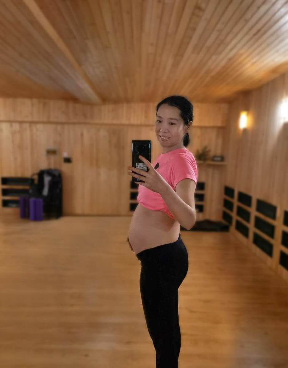 照片中李晓霞穿了粉色的上衣,露出鼓起的肚子,温柔地笑着,看起来状态不错。