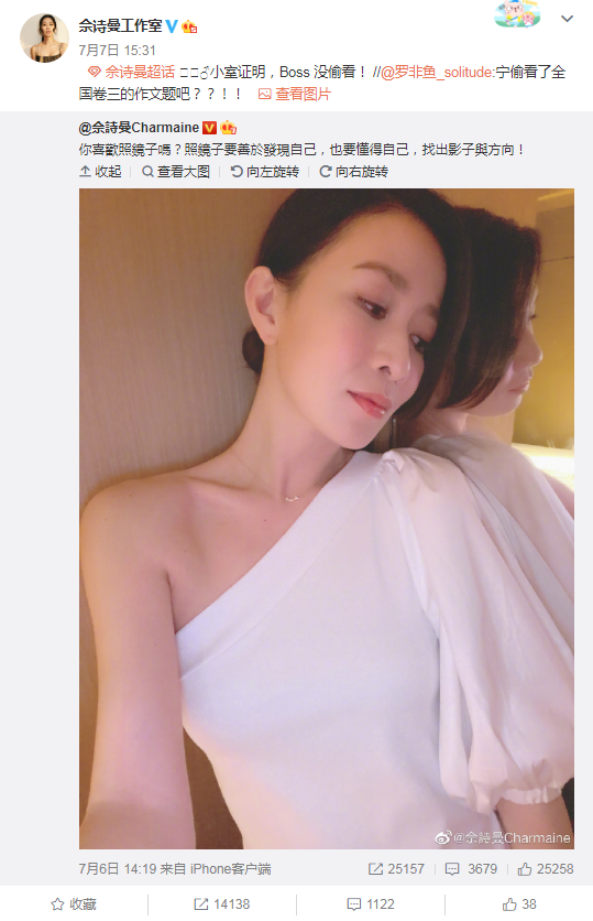 据悉,6日佘诗曼发布自拍并配上文案“你喜欢照镜子吗?照镜子要善于发现自己,也要懂得自己,找出影子与方向!”佘诗曼在微博上的这番感悟与今年高考全国三卷的作文在旅途中寻找“镜子”与“自画像”的立意不谋而合。随后佘诗曼工作室转发网友微博,回应”小室证明,Boss 没偷看!”
