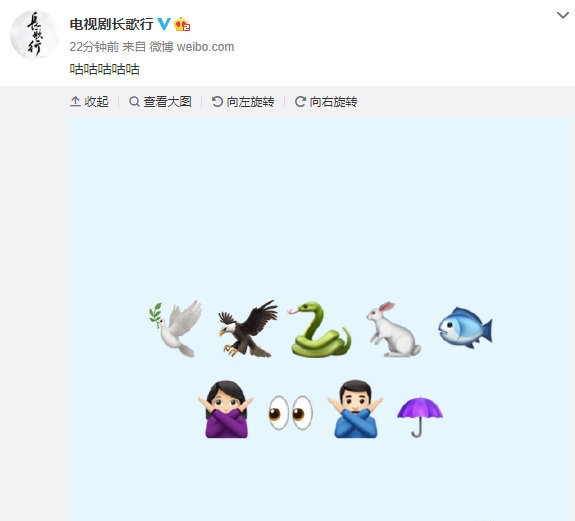 7月13日,电视剧《长歌行》官方微博号只发了五个字“咕咕咕咕咕”,但是配了一张图,图中上面是五种动物,下面是两个表示拒绝的人物动作、一双眼睛、一把伞。这个图片让众多网友开始纷纷猜测,《长歌行》莫不是要官宣啦?