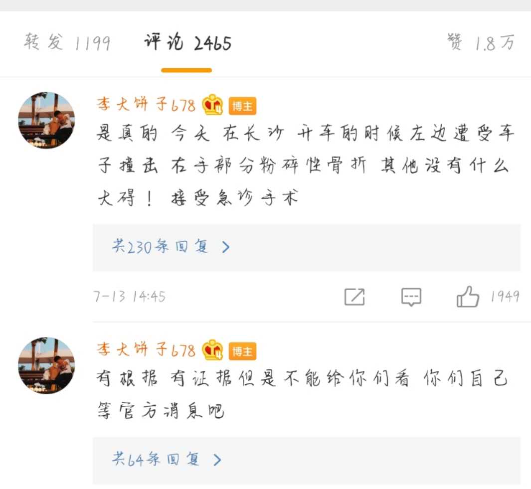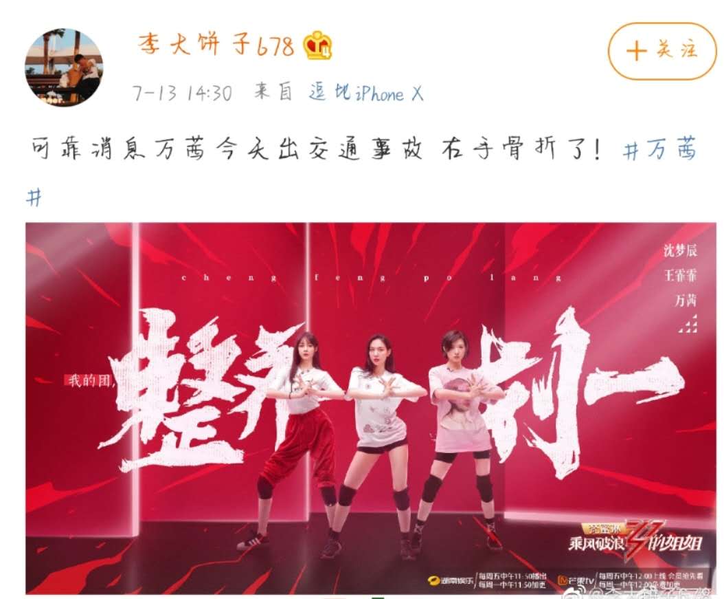 7月13日,有网友在微博上爆料,称:“可靠消息,万茜今天出交通事故,右手骨折了!”还在评论里补充道:“是真的,今天在长沙开车的时候,左边遭受车子撞击,右手部分粉碎性骨折,其他没有什么大碍!接受急诊手术!”还告诉网友有证据但是不能发,让大家等官方消息。这个爆料一经发布,便引起众多正在追《乘风破浪的姐姐》的观众的注意。