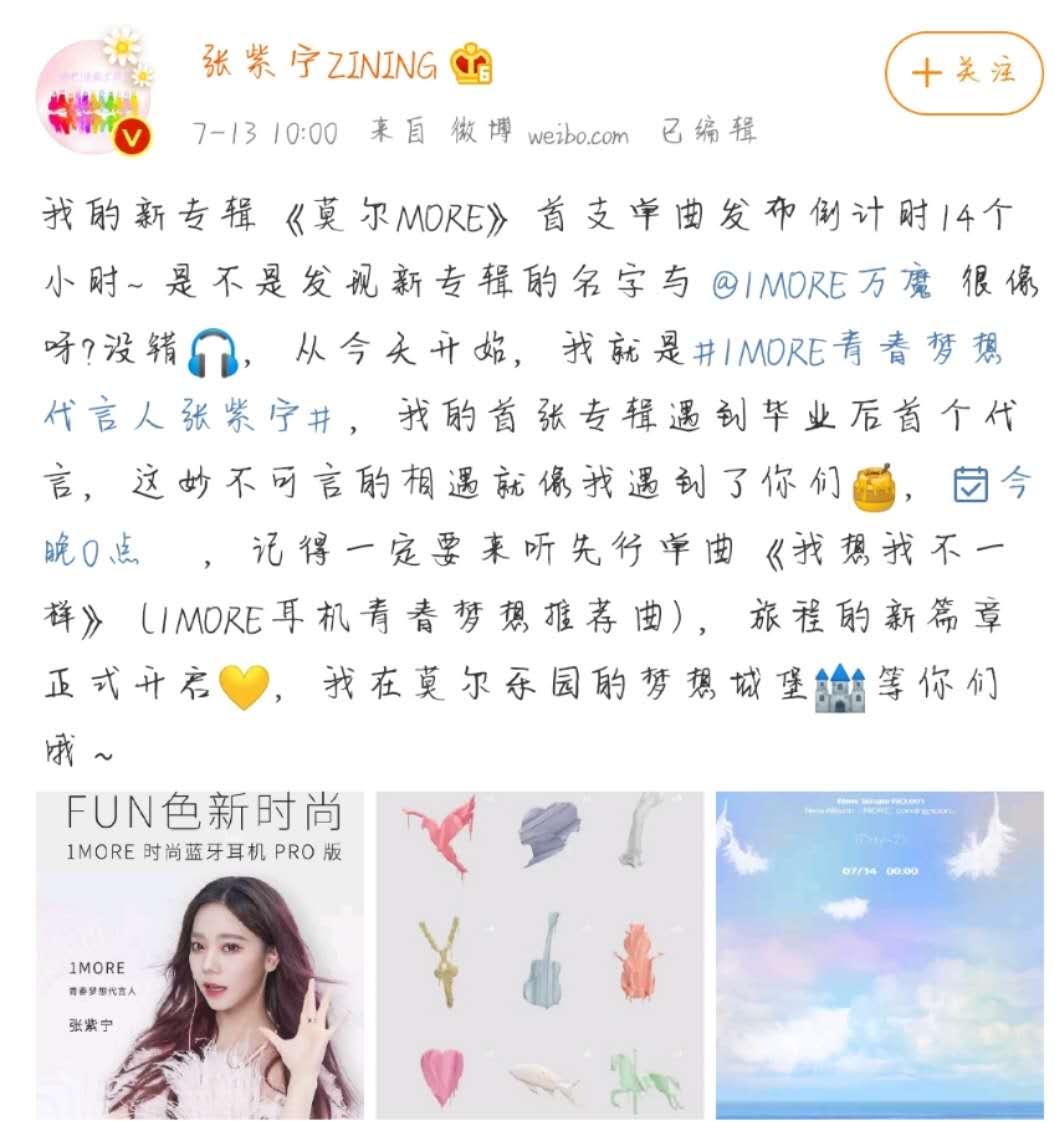 7月13日,张紫宁发微博宣布,自己的首张个人专辑《莫尔MORE》的先行单曲《我想我不一样》在14号凌晨发布,喜欢张紫宁的小伙伴一定要去听哦!