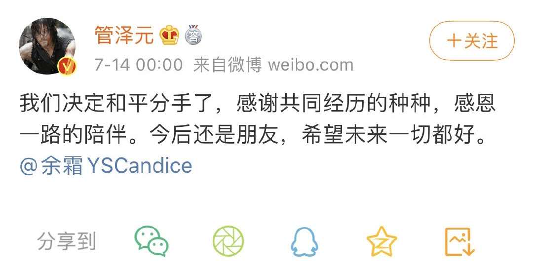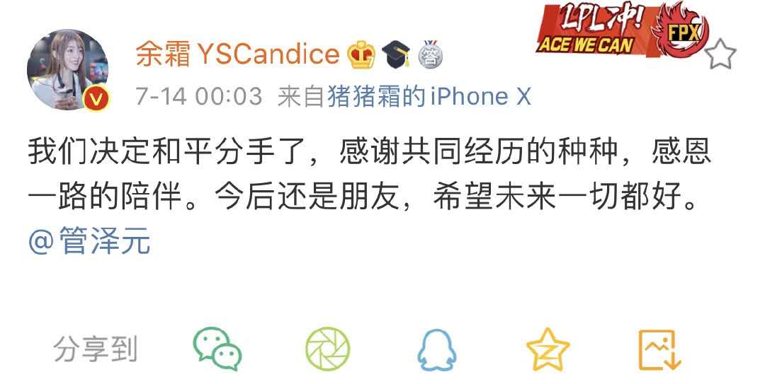 7月14日凌晨,《英雄联盟》LPL官方解说管泽元和官方主持人余霜在微博上宣布和平分手,两人发的微博内容相同:“我们决定和平分手了,感谢共同经历的种种,感恩一路的陪伴。今后还是朋友,希望未来一切都好。”随后,两人分手的消息也登上了微博热搜第一。