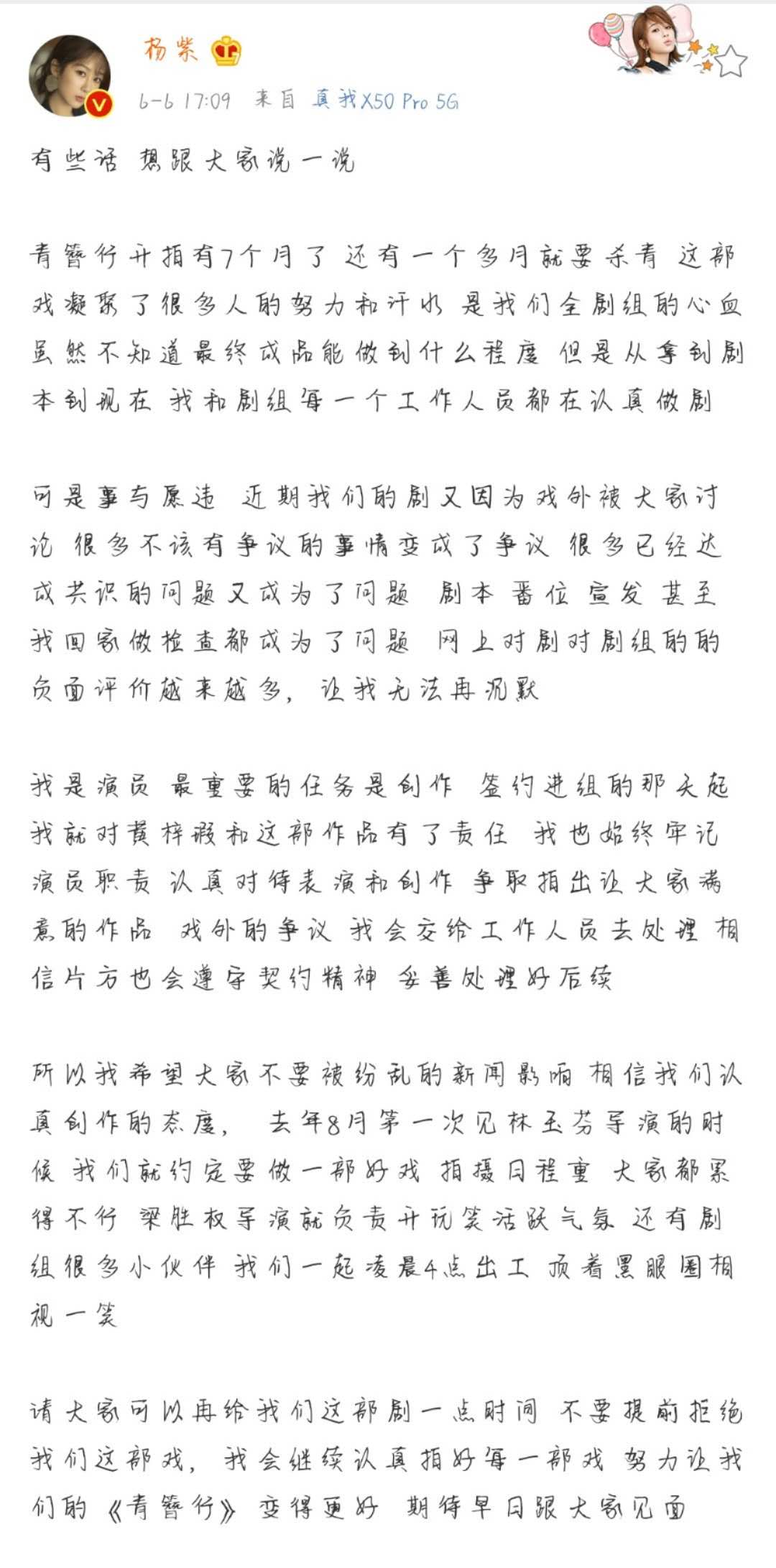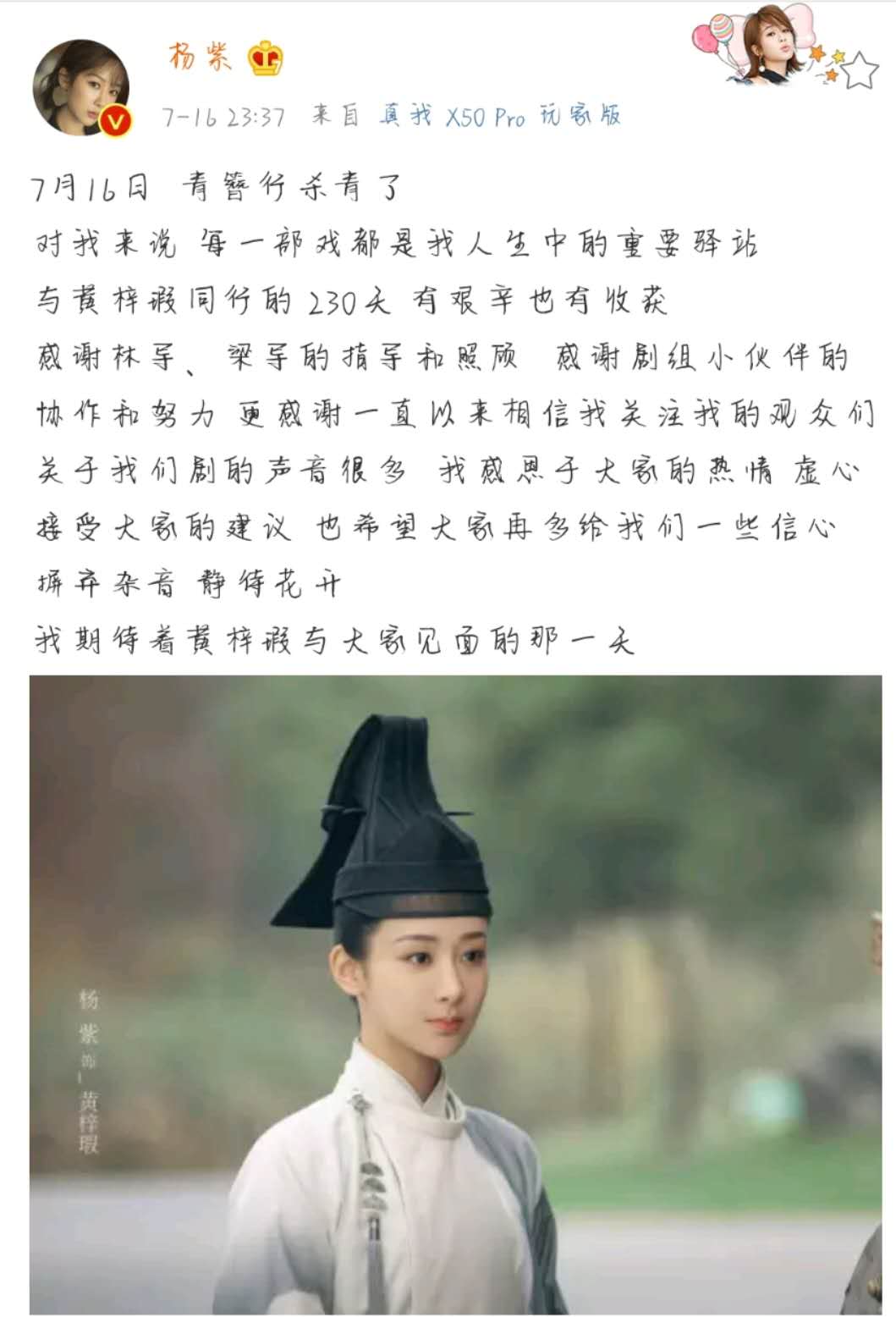 7月16日,《青簪行》杀青之后,杨紫发长文,称:“每一部戏都是我人生中的重要驿站,与黄梓瑕同行的230天,有艰辛也有收获。”杨紫也感谢了导演、剧组的小伙伴以及一直关注自己的观众。她还表示:“关于我们剧的声音很多,我感恩于大家的热情,虚心接受大家的建议,也希望大家再多给我们一些信心,摒弃杂音,静待花开。”