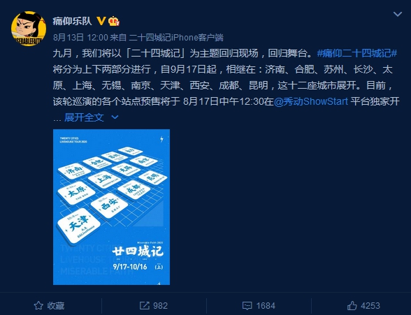 8月13日,痛仰乐队公布了乐队今年的巡演计划。他们以“二十四城记”为主题回归现场,回归舞台,在全国24个城市进行巡回演出。