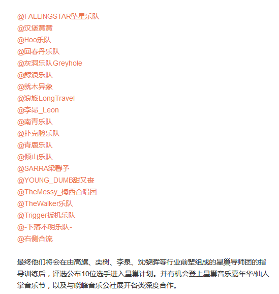 这二十个音乐人和乐队组合将接受高旗、栾树、李泉、沈黎晖等行业前被的指导训练,最终将挑选出其中十个进入星巢计划。他们将有机会登上星巢音乐嘉年华、仙人掌音乐节的舞台进行演出,并且还有机会与晓峰音乐公社进行合作。