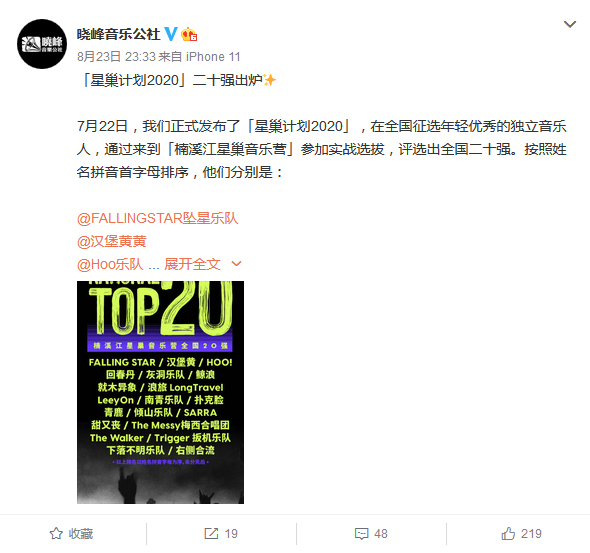8月23日,晓峰音乐公社公布了在星巢音乐营中选拔出的全国二十强阵容,分别是:FALLINGSTAR坠星乐队、汉堡黄黄、Hoo乐队、回春丹乐队、灰洞乐队Greyhole、鲸浪乐队、就木异象、浪旅LongTravel、李昂、南青乐队、扑克脸乐队、青鹿乐队、倾山乐队、梁馨予、甜又丧、梅西合唱团、TheWalker乐队、Trigger扳机乐队、下落不明乐队、右侧合流。