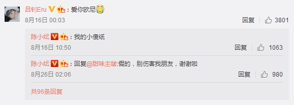 8月26日凌晨,陈小纭在自己的微博评论区回复网友关于吕钊插足的传闻,表示:假的,别伤害我朋友。帮自己闺蜜辟谣插足传闻。