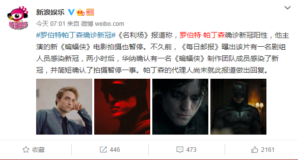 有人猜测,罗伯特·帕丁森之所以感染新冠,或许正因为电影新《蝙蝠侠》。不久前,《每日邮报》曝出该片有一名剧组人员感染新冠,两小时后,华纳确认有一名《蝙蝠侠》制作团队成员感染了新冠,并简短确认了拍摄暂停一事。帕丁森的代理人尚未就此报道做出回复。