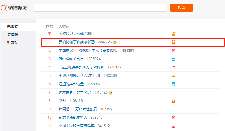罗伯特·帕丁森是近十年最炙手可热的好莱坞男星,主演过《暮光之城》《兰开斯特之王》《灯塔》等热门电影,也是本年度大热电影《信条》的主角之一,粉丝遍布全球,高达数亿人。因此,#罗伯特帕丁森确诊新冠#这个话题一出,瞬间登上微博热搜第一名。