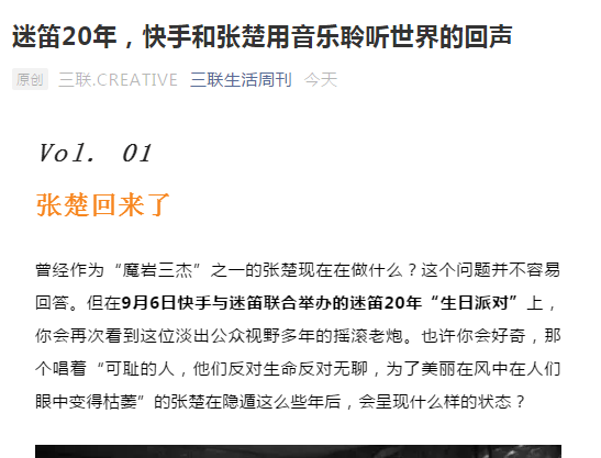 快讯:据《三联生活周刊》公众号报道,魔岩三杰之一的张楚将会现身9月6日举办的迷笛生日派对,这将是张楚隐退26年以来首场直播现场秀,让数万歌迷无比期待!