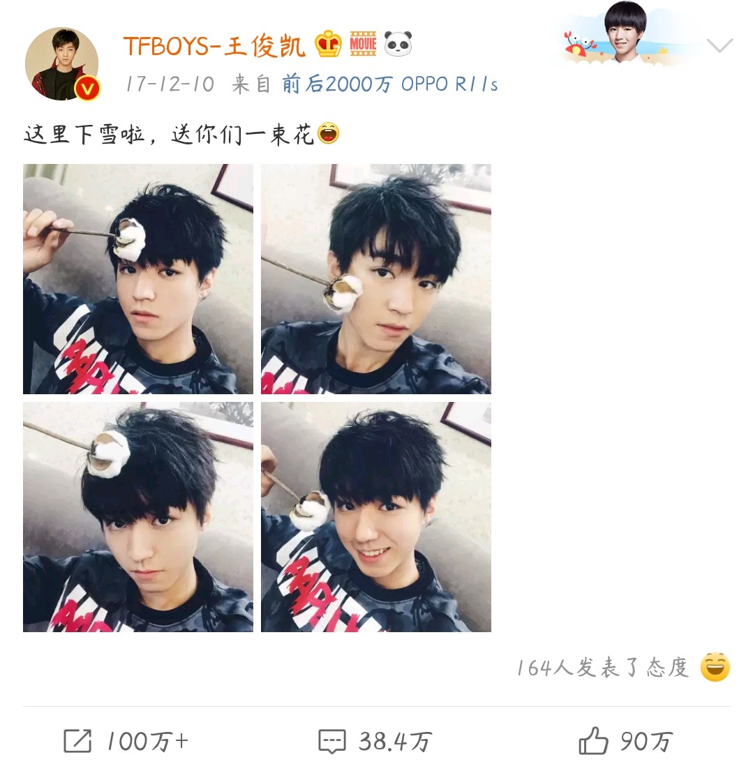 早在2017年冬天的时候,身在剧组拍戏的王俊凯拿着一支小棉花发了一条微博的四宫格,文案是:这里下雪啦,送你们一束花。留言区纷纷喊话,你倒是真的送我们呀!