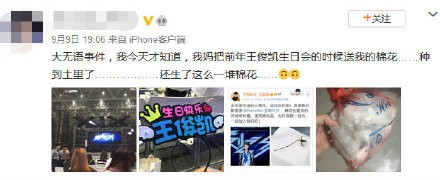 近日,王俊凯的粉丝发微博称,有一个大无语事件,妈妈把自己爱豆送的礼物种了,现在已经不是当初了那个小花花的,他已经是一个成熟的棉花了,还生了一堆棉花。这条微博被大量网友截图转发,网友们纷纷化身段子手大师,大开脑洞。