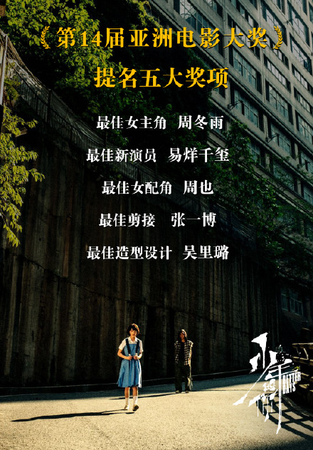此次,亚洲电影大奖,《少年的你》共入围了5个奖项,分别是“最佳女演员”周冬雨、“最佳新演员”易烊千玺、“最佳女配角”周也、最佳剪接和最佳造型设计。